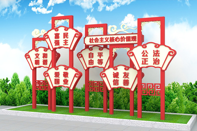 河南核心價值觀雕塑焊接完工 河南200臺路名牌燈箱效果圖